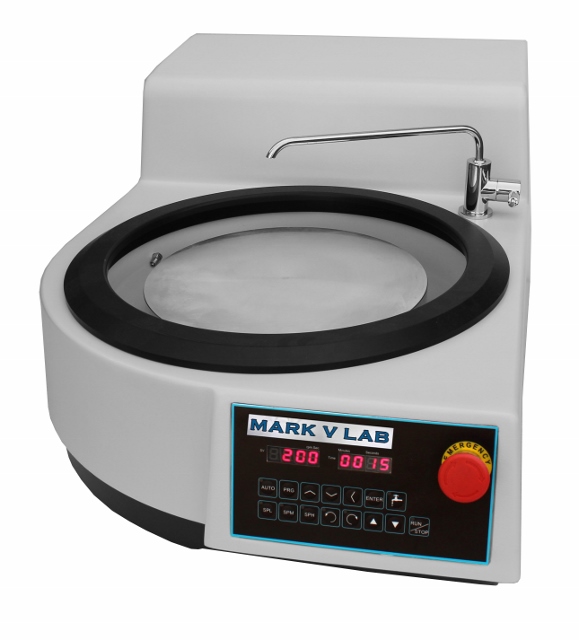 Mark V Lab Metapol AV Single Wheel, Bench Top Grinder/Polishers Single Wheel Grinder Polisher is available with for 12" or 14" wheels. The Metapol AV Features variable speed (100-1000 rpm), preset fast speed buttons (100, 200, 300 rpm), auto mode (programmable speed, direction and time), tough and rugged GRP (glass reinforced plastic) construction, water inlet and outlet for wheel lubrication. Includes 12" Aluminum Wheel,Splash Guard and Cover.Extra Wheels and Paper Holding Ring are quoted separately. The Metapol polisher has a built-in transformer so it can be operated at either 110V or 220V (factory preset).