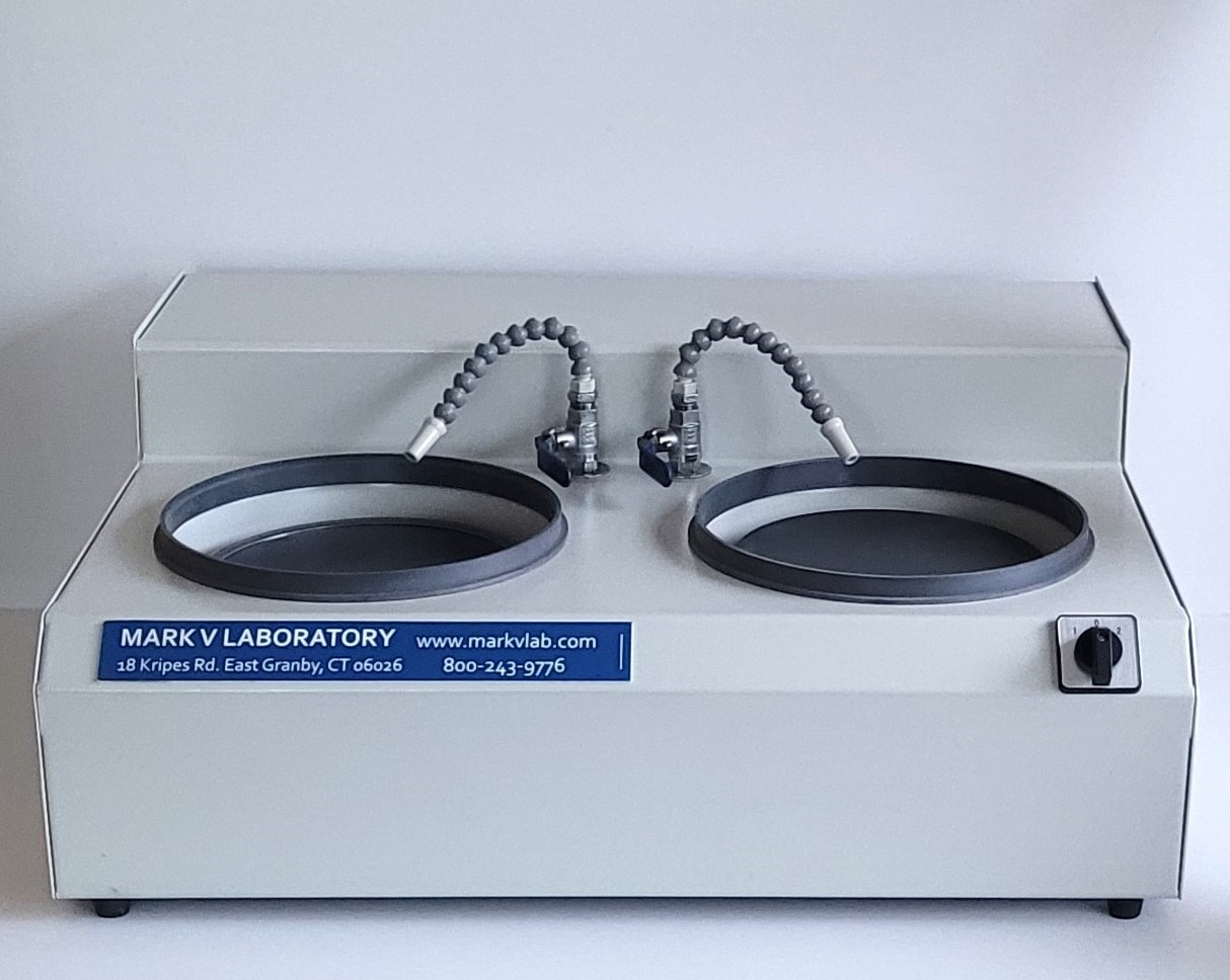 Mark V Lab MECAPOL 3B Reconditioned Bench Top Dual Wheel Grinder/Polisher features: Two Speed (150-300 rpm) operation with standard 1/2Hp. Motor and Rugged Steel construction. The 3B2 utilizes 2 ea. 8" PVC Wheels and comes with Splash Guards & Paper Holding Band. Full 1 year factory warranty.110V 60 Hz.